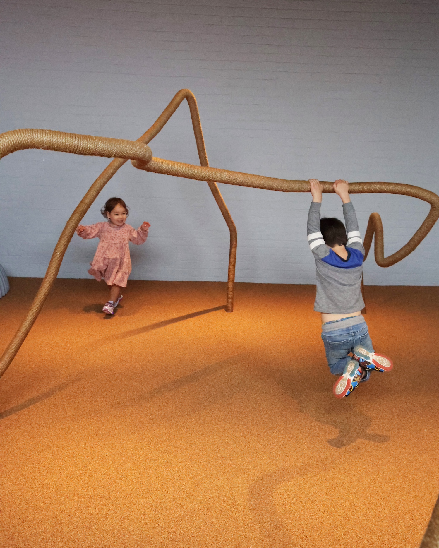 You will pave paths of life with play, 2025. Stainless steel, manila rope, toulipier wood, paint. Dimensions variable. Commissioned by The Noguchi Museum. Photography by Chanel Matsunami Govreau.