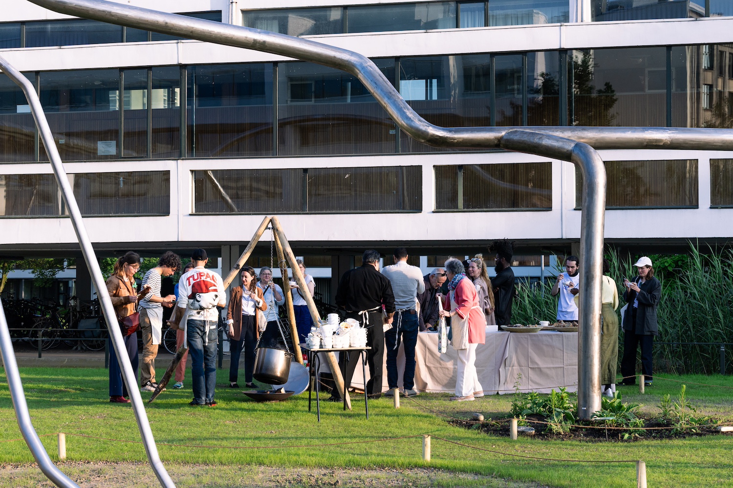 You will find companionship in greener grounds, 2024. Come closer opening. Steel, concrete, manilla rope, edible garden, grass, woven palm tree fronds, reconstituted metal and marble. Dimensions variable. Commissioned by DeSingel, Antwerp, Belgium. Photography by Britt Ryckebosch.