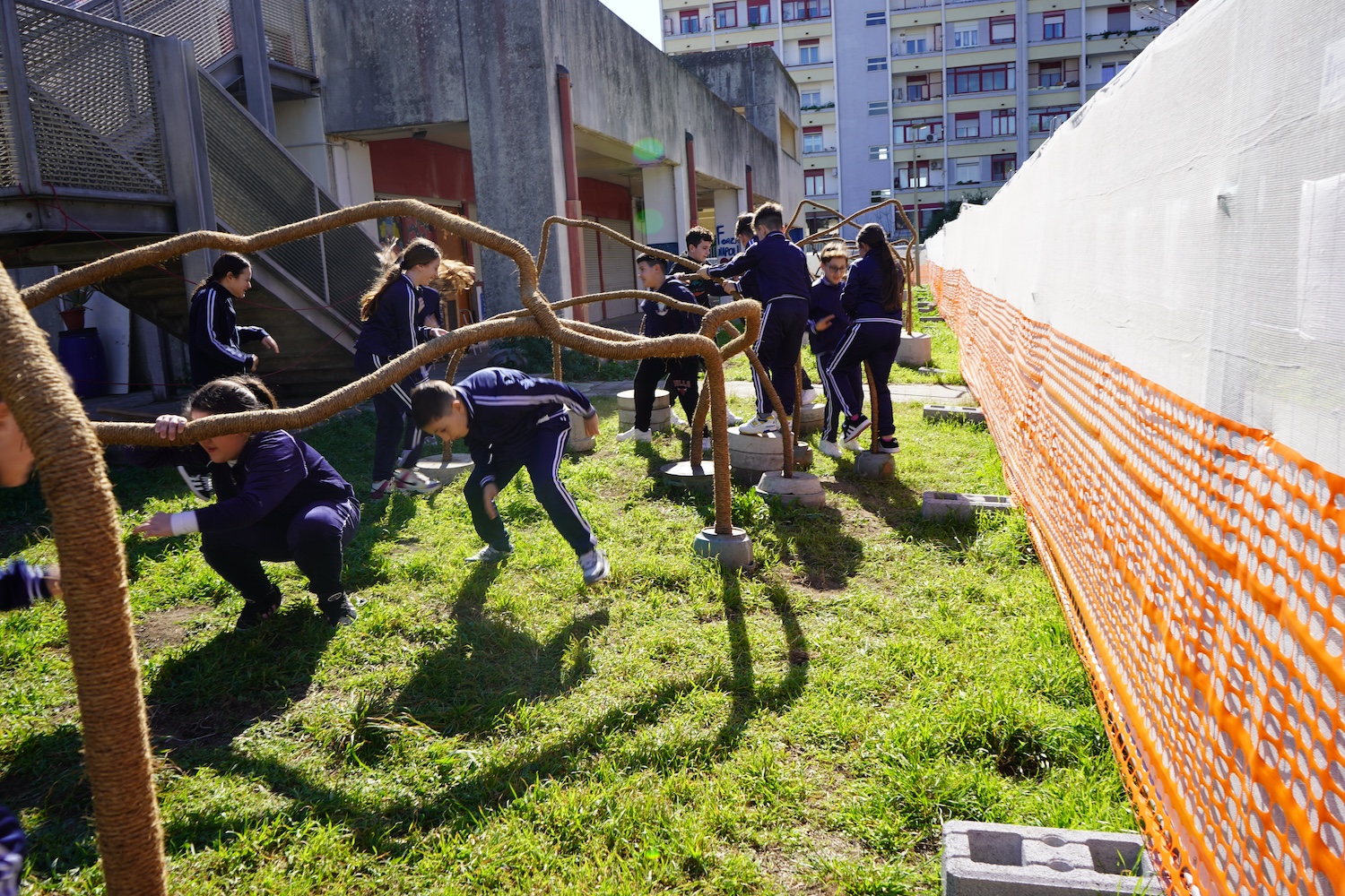 Giocherai nel quotidiando, correndo / You will run in the everyday playing, 2024. Stainless steel pipes, cement, brass, bronze, jute and living moss. 16.4 X 110.6 X 50.9 ft (5 X 33.7 X 15cm.). Commissioned by Fondazione Donnaregina per le arti contemporanee, Ponticelli, Naples.Â